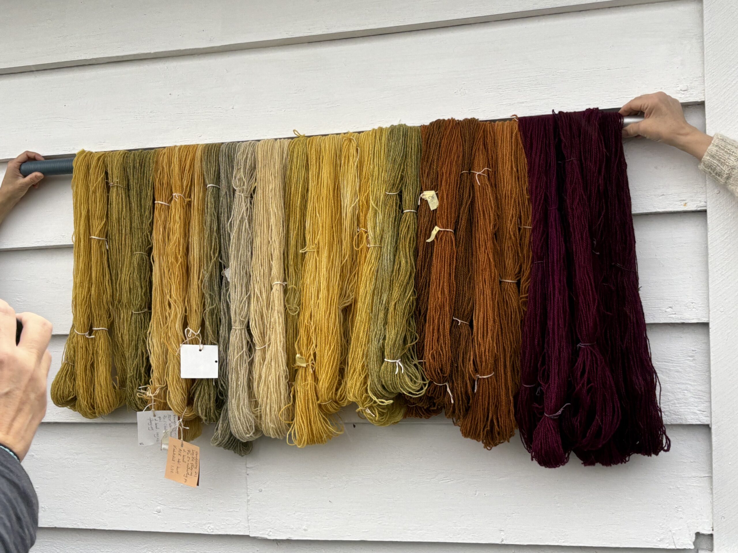 Det var 8 deltakere på kurset. Garnet var ASK ullgarn, oppdelt i 25 grams hesper: ubleket hvit, melert grå (ubleket) og lys grå melert (halvbleket). Vi brukte lagvis farging og de fleste grytene ble kokt 2 ganger i løpet av 24-36 timer. Alt garnet ble skylt bortsett fra blærelavgarnet som vi lot tørke og overlot til deltakerne å skylle hjemme etter noen dager. Det ble også laget små glass med navlelav-pasta som deltakerne fikk med seg hjem. Søndag ble det dessuten gitt en innføring i solfarging med lav.