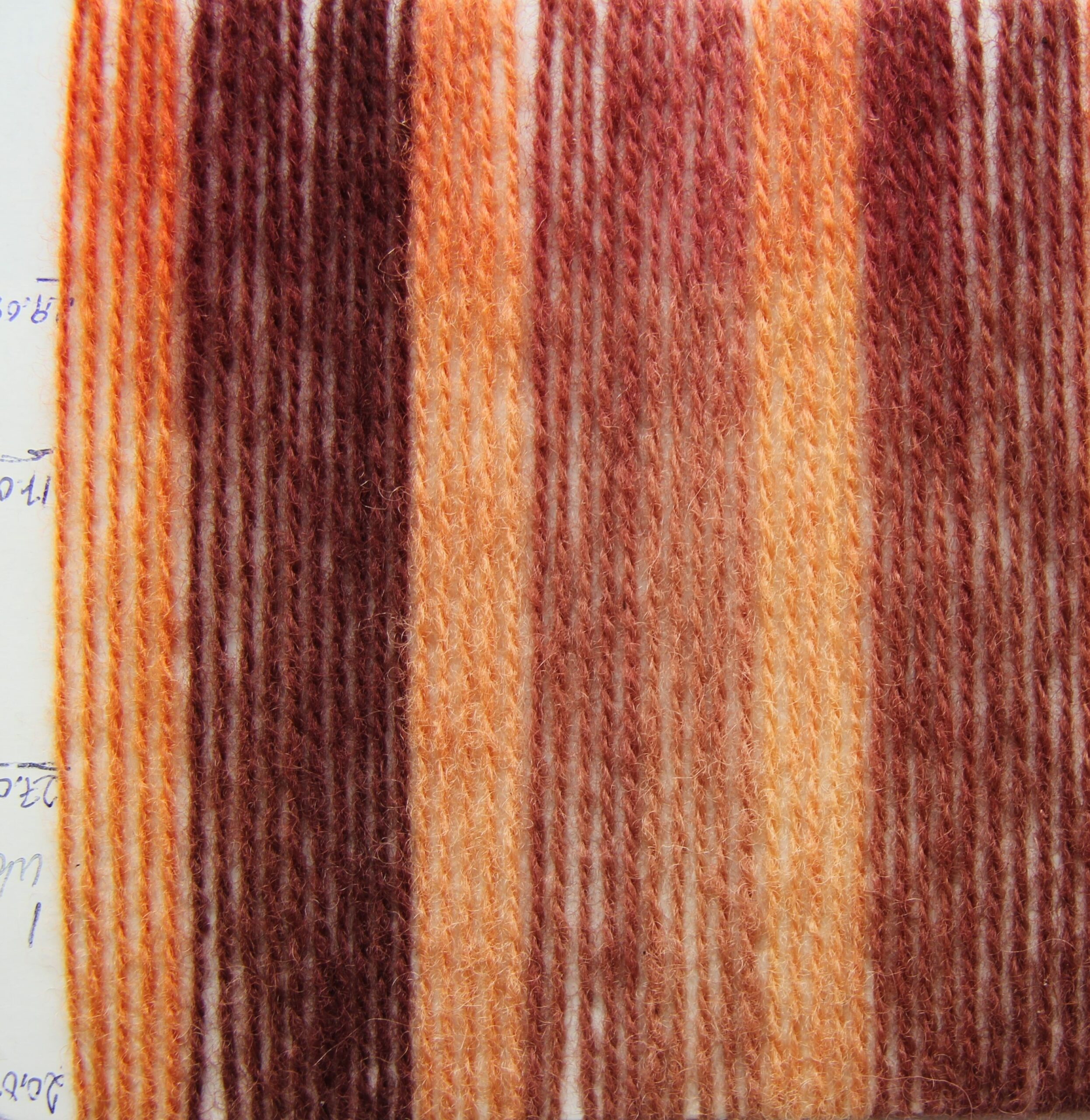 Beiseoppskriftene: Beis 1: 25% alun+20% vinstein, beis 2: 25% titanoksalat+20% vinstein, beis 3: 25% titanoksalat. Det ble beiset 25g bunter med Ask 2 garn fra Hillesvåg.