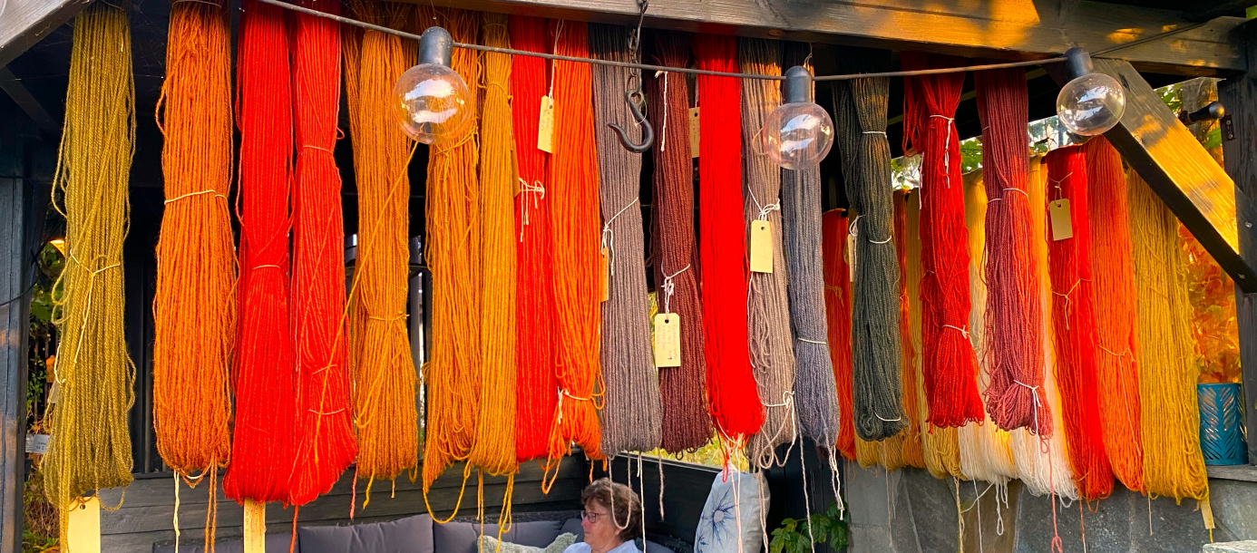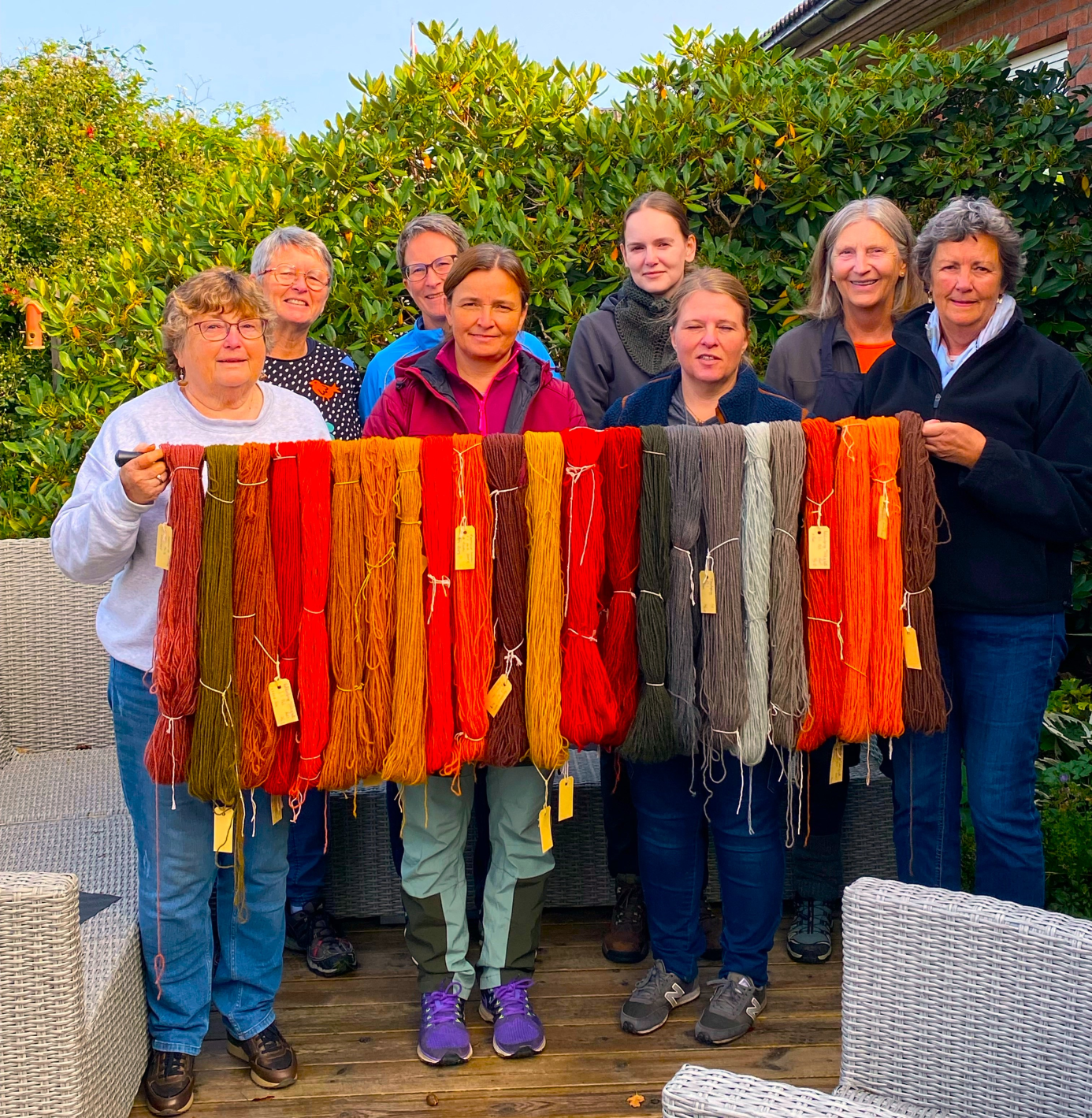 Helgen 29.9 til 1.10 hadde vi avsatt til farging. En av deltakerne, Elisabeth, var så grei at hun stilte sin overbygde pergola til vår disposisjon og hennes mann ordnet med ledninger ut alle vinduer han fant slik at vi kunne ha 6 plater med fargekjeler i gang på en gang. Det var lagt opp vannledning og deltakerne hadde blitt bedt om å ta med seg bøtte, rørpinne, forkle og grytekluter. Kjeler og plater hadde Marit og jeg med og vi hadde også tørket sopp med. Garn hadde vi kjøpt inn fra Hillesvåg, ferdig vasket. Beis ble kjøpt inn fra Raffina.no.