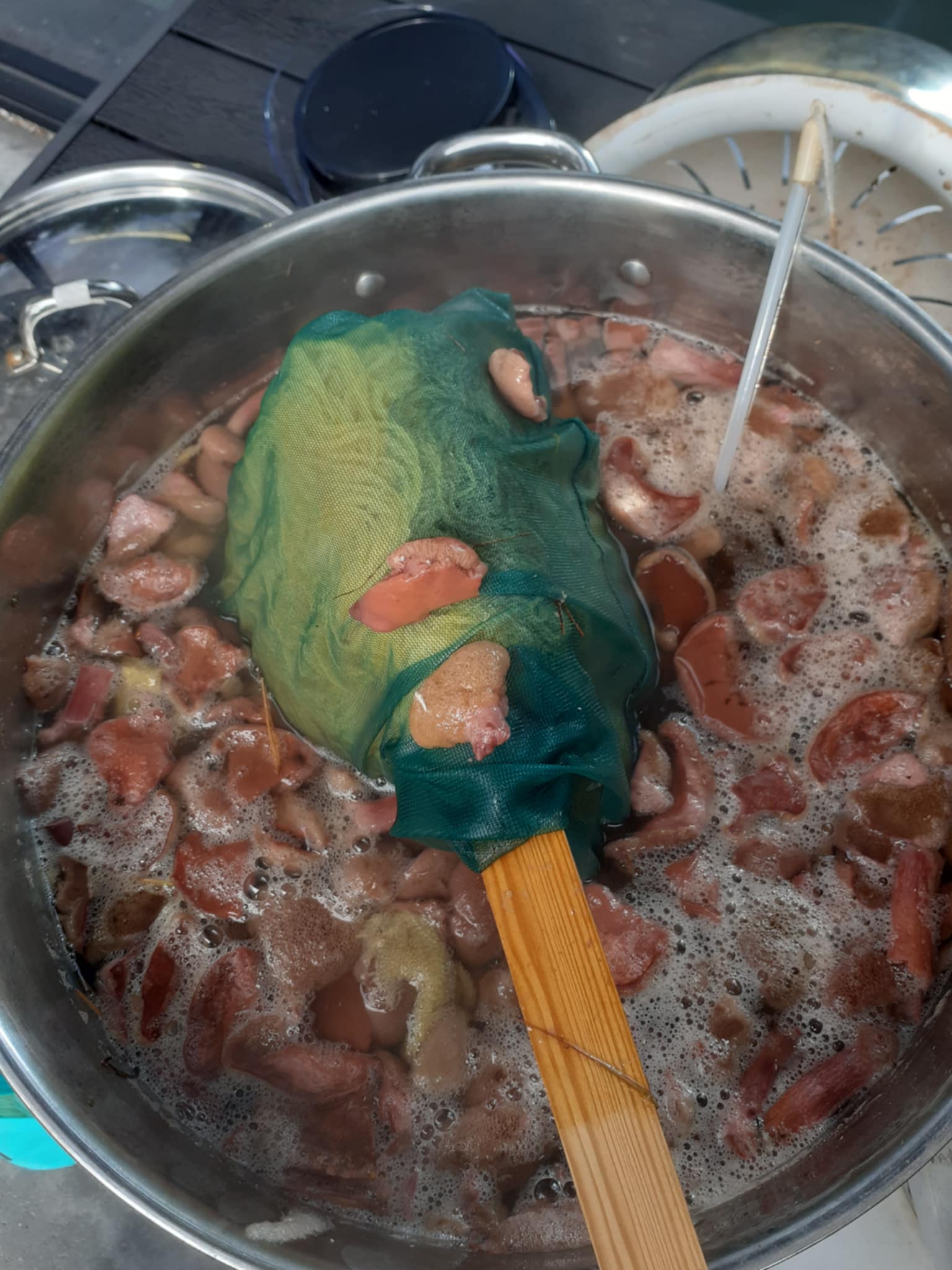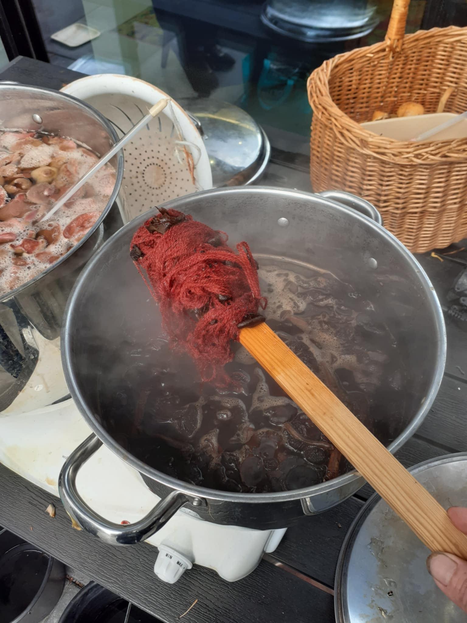 Tilbake på Sundvollen Hotell farget vi med fersk kusopp og de få rødskiveslørsopper vi hadde funnet. Jeg hadde heldigvis tatt med endel tørka rødskive hatter, så fargen ble skikkelig rød og av kusoppen ble det fint gul.