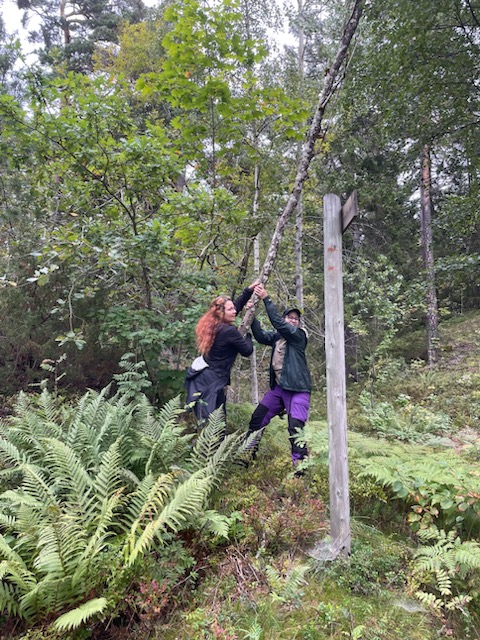 Kristine Jorskogen og Francesca Tullio må ha ned dette døde treet for å få fatt i den store kanelkjuka høyt oppe.
