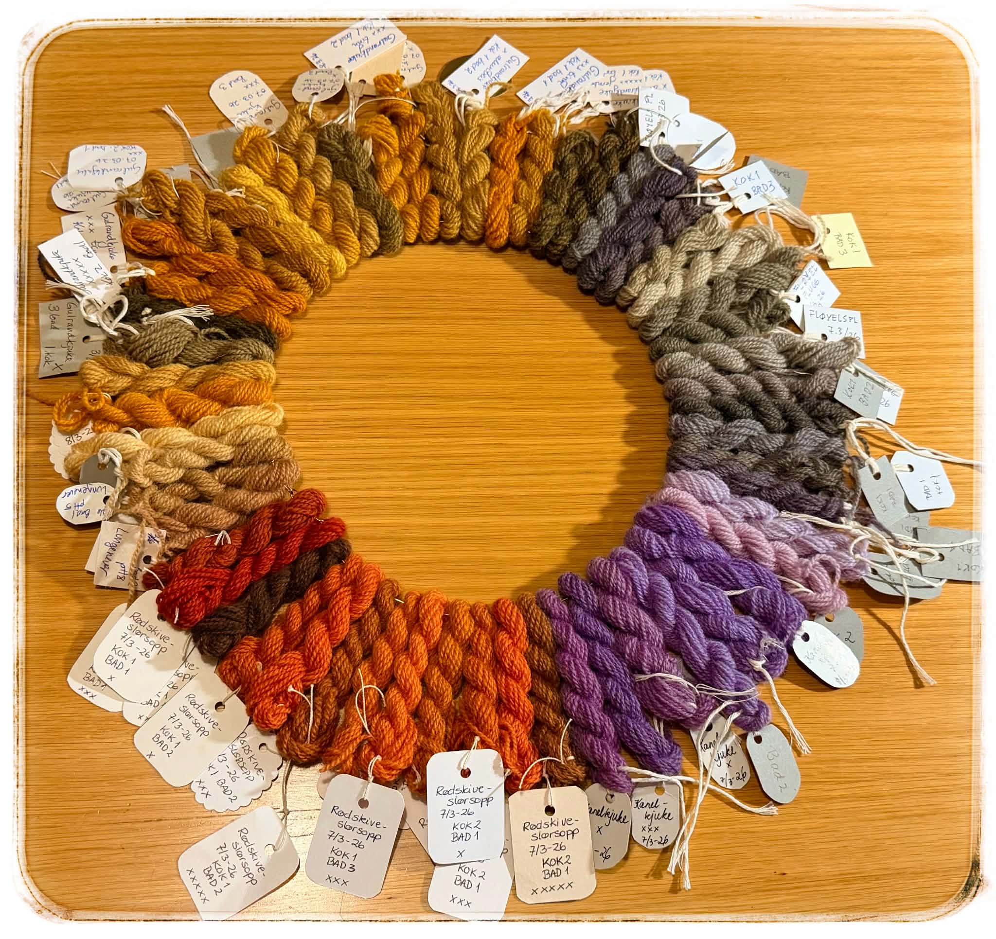 Det ble farger med 4 fargesopper:  kanelkjuke, rødskiveslørsopp hatter, gulrandkjuke og fløyelspluggsopp.  Til sammen ble det nesten 60 fargeprøver.  Vi brukte de nye beisemetodene som beskrevet i boka til Anna-Elise Torkelsen, Vakre farger fra naturen.  Soppen ble også kokt to ganger og brukt på nytt til farging også etter kok 2.  Resultatene viser at det er overraskende mye farge igjen i soppen etter første gangs kok og at all fargesopp dermed bør kokes to ganger.  Det var kanelkjuke som ga svakest fargeresultat etter kok 2.  Og som alltid på soppfargekurs:  det som tar aller mest tid av kurset, er merking av garnprøver til alle deltakerne.