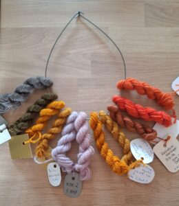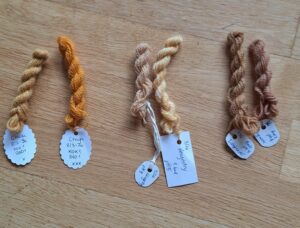 To av gruppene på kurset farget med gulrandkjuke.  Den ene gruppa tok første bad med jernbeisa garn for å få ut de grønne fargene, så med alun og tinn i de neste badene, den andre gruppa farga med alun-, tinn- og jernbeisa garn i alle badene.  Resultatene ble overraskende like farger for begge gruppene.